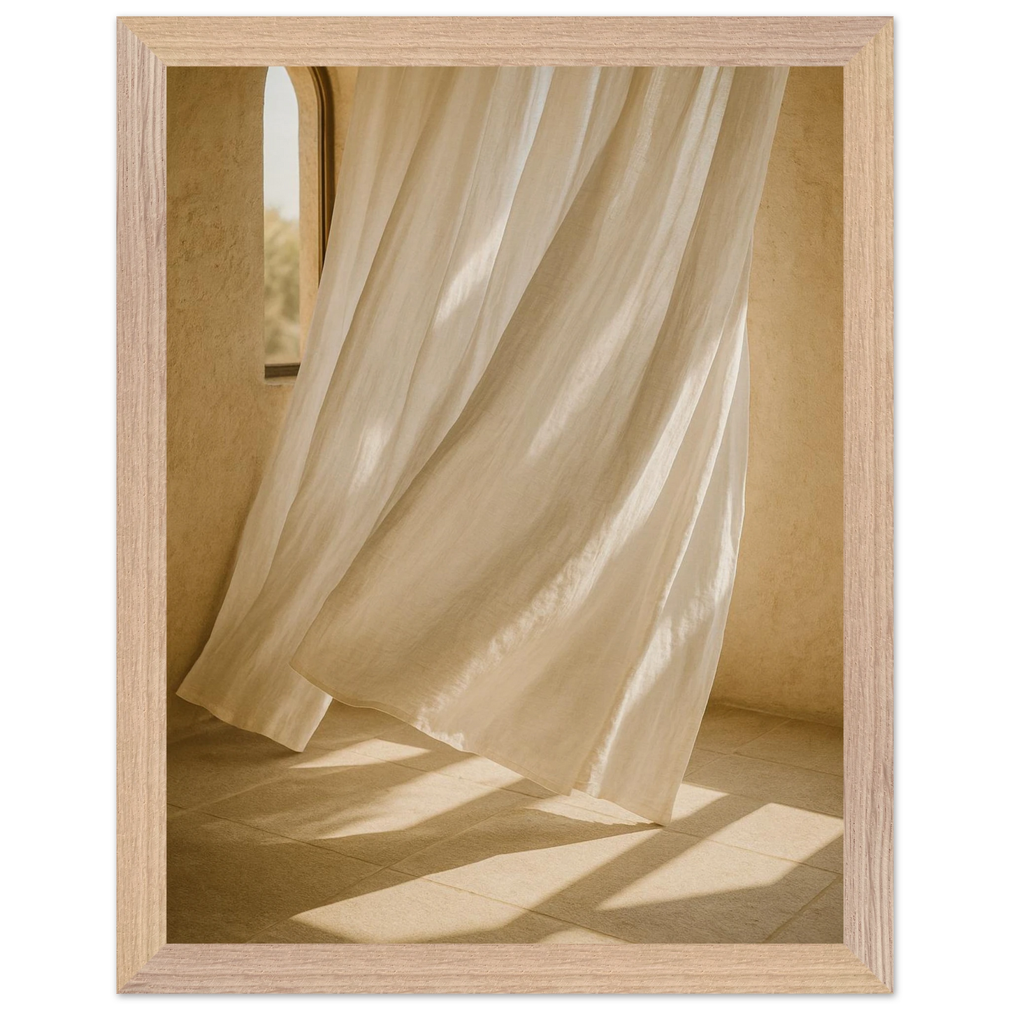 Ljusvinden — Swedish for “The Light Wind” — captures a fleeting moment of softness and stillness. A linen curtain lifts gently in the warm breeze, casting sculptural shadows across a stone floor. Framed by an arched window and sun-soaked wall, this image speaks to the beauty of movement, texture, and natural light.