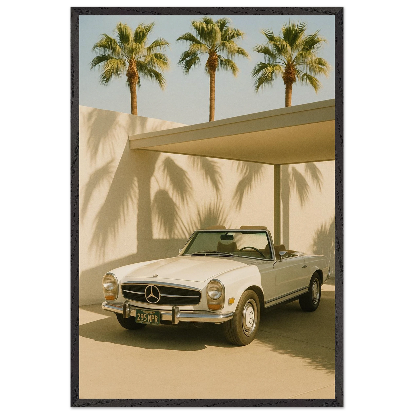 Palmgarage captures the sun-soaked magic of midcentury California cool. A vintage Mercedes convertible rests under a minimalist carport as palm tree shadows stretch across the stucco walls behind. The soft golden haze, crisp geometry, and relaxed luxury feel make this a visual ode to desert design, vintage style, and timeless calm.
