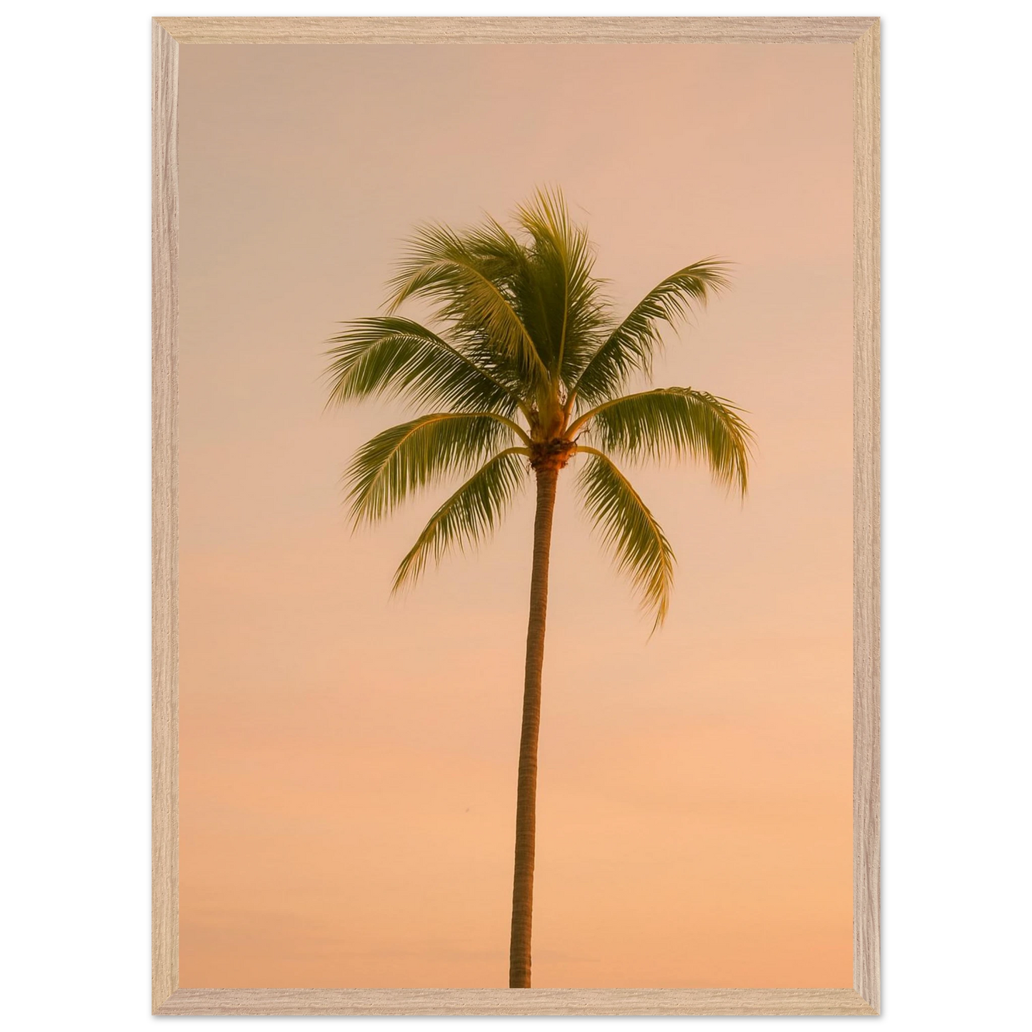 Stillhetspalm — Swedish for “Palm of Stillness” — captures the elegance of restraint. A single palm tree rises calmly against a soft pastel sky at golden hour, its fronds catching light as the breeze moves gently through. This vertically composed image balances negative space and organic form, evoking clarity, quiet luxury, and visual ease.